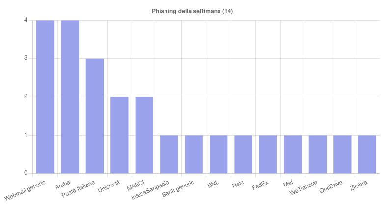 Secondo il Report CERT, le campagne di phishing della settimana 12 – 18 Ottobre hanno coinvolto 14 diversi brand. Ad attirare maggiormente l’attenzione, per quantità, sono state le campagne a tema Aruba, Poste Italiane e le webmail generiche.